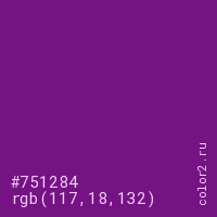 Цвет #751284 в цветовой модели RGB обозначается тремя октетами (117, 18, 132) в десятичном формате и #751284 в шестнадцатиричном (hex) формате, которые являются интенсивностью красного 117 (hex 75), интенсивность зелёного 18 (hex 12) и интенсивность синего 132 (hex 84).