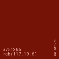Цвет #751306 в цветовой модели RGB обозначается тремя октетами (117, 19, 6) в десятичном формате и #751306 в шестнадцатиричном (hex) формате, которые являются интенсивностью красного 117 (hex 75), интенсивность зелёного 19 (hex 13) и интенсивность синего 6 (hex 06).
