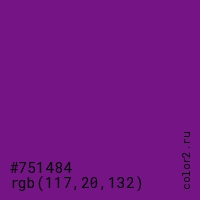 Цвет #751484 в цветовой модели RGB обозначается тремя октетами (117, 20, 132) в десятичном формате и #751484 в шестнадцатиричном (hex) формате, которые являются интенсивностью красного 117 (hex 75), интенсивность зелёного 20 (hex 14) и интенсивность синего 132 (hex 84).