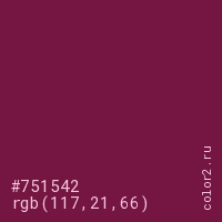 Цвет #751542 в цветовой модели RGB обозначается тремя октетами (117, 21, 66) в десятичном формате и #751542 в шестнадцатиричном (hex) формате, которые являются интенсивностью красного 117 (hex 75), интенсивность зелёного 21 (hex 15) и интенсивность синего 66 (hex 42).