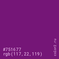 Цвет #751677 в цветовой модели RGB обозначается тремя октетами (117, 22, 119) в десятичном формате и #751677 в шестнадцатиричном (hex) формате, которые являются интенсивностью красного 117 (hex 75), интенсивность зелёного 22 (hex 16) и интенсивность синего 119 (hex 77).