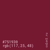 Цвет #751930 в цветовой модели RGB обозначается тремя октетами (117, 25, 48) в десятичном формате и #751930 в шестнадцатиричном (hex) формате, которые являются интенсивностью красного 117 (hex 75), интенсивность зелёного 25 (hex 19) и интенсивность синего 48 (hex 30).