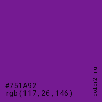 Цвет #751A92 в цветовой модели RGB обозначается тремя октетами (117, 26, 146) в десятичном формате и #751A92 в шестнадцатиричном (hex) формате, которые являются интенсивностью красного 117 (hex 75), интенсивность зелёного 26 (hex 1A) и интенсивность синего 146 (hex 92).