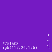 Цвет #751AC3 в цветовой модели RGB обозначается тремя октетами (117, 26, 195) в десятичном формате и #751AC3 в шестнадцатиричном (hex) формате, которые являются интенсивностью красного 117 (hex 75), интенсивность зелёного 26 (hex 1A) и интенсивность синего 195 (hex C3).