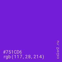 Цвет #751CD6 в цветовой модели RGB обозначается тремя октетами (117, 28, 214) в десятичном формате и #751CD6 в шестнадцатиричном (hex) формате, которые являются интенсивностью красного 117 (hex 75), интенсивность зелёного 28 (hex 1C) и интенсивность синего 214 (hex D6).