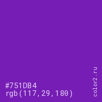Цвет #751DB4 в цветовой модели RGB обозначается тремя октетами (117, 29, 180) в десятичном формате и #751DB4 в шестнадцатиричном (hex) формате, которые являются интенсивностью красного 117 (hex 75), интенсивность зелёного 29 (hex 1D) и интенсивность синего 180 (hex B4).