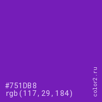 Цвет #751DB8 в цветовой модели RGB обозначается тремя октетами (117, 29, 184) в десятичном формате и #751DB8 в шестнадцатиричном (hex) формате, которые являются интенсивностью красного 117 (hex 75), интенсивность зелёного 29 (hex 1D) и интенсивность синего 184 (hex B8).