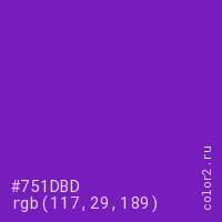 Цвет #751DBD в цветовой модели RGB обозначается тремя октетами (117, 29, 189) в десятичном формате и #751DBD в шестнадцатиричном (hex) формате, которые являются интенсивностью красного 117 (hex 75), интенсивность зелёного 29 (hex 1D) и интенсивность синего 189 (hex BD).