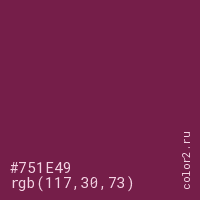 Цвет #751E49 в цветовой модели RGB обозначается тремя октетами (117, 30, 73) в десятичном формате и #751E49 в шестнадцатиричном (hex) формате, которые являются интенсивностью красного 117 (hex 75), интенсивность зелёного 30 (hex 1E) и интенсивность синего 73 (hex 49).