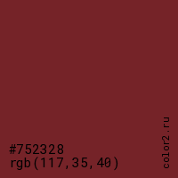 Цвет #752328 в цветовой модели RGB обозначается тремя октетами (117, 35, 40) в десятичном формате и #752328 в шестнадцатиричном (hex) формате, которые являются интенсивностью красного 117 (hex 75), интенсивность зелёного 35 (hex 23) и интенсивность синего 40 (hex 28).