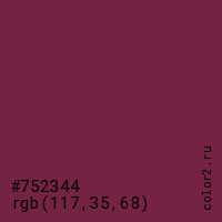 Цвет #752344 в цветовой модели RGB обозначается тремя октетами (117, 35, 68) в десятичном формате и #752344 в шестнадцатиричном (hex) формате, которые являются интенсивностью красного 117 (hex 75), интенсивность зелёного 35 (hex 23) и интенсивность синего 68 (hex 44).