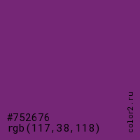 Цвет #752676 в цветовой модели RGB обозначается тремя октетами (117, 38, 118) в десятичном формате и #752676 в шестнадцатиричном (hex) формате, которые являются интенсивностью красного 117 (hex 75), интенсивность зелёного 38 (hex 26) и интенсивность синего 118 (hex 76).
