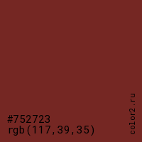 Цвет #752723 в цветовой модели RGB обозначается тремя октетами (117, 39, 35) в десятичном формате и #752723 в шестнадцатиричном (hex) формате, которые являются интенсивностью красного 117 (hex 75), интенсивность зелёного 39 (hex 27) и интенсивность синего 35 (hex 23).