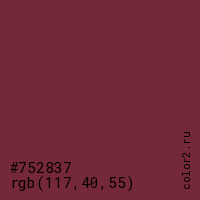 Цвет #752837 в цветовой модели RGB обозначается тремя октетами (117, 40, 55) в десятичном формате и #752837 в шестнадцатиричном (hex) формате, которые являются интенсивностью красного 117 (hex 75), интенсивность зелёного 40 (hex 28) и интенсивность синего 55 (hex 37).