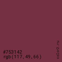 Цвет #753142 в цветовой модели RGB обозначается тремя октетами (117, 49, 66) в десятичном формате и #753142 в шестнадцатиричном (hex) формате, которые являются интенсивностью красного 117 (hex 75), интенсивность зелёного 49 (hex 31) и интенсивность синего 66 (hex 42).