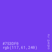 Цвет #753DF0 в цветовой модели RGB обозначается тремя октетами (117, 61, 240) в десятичном формате и #753DF0 в шестнадцатиричном (hex) формате, которые являются интенсивностью красного 117 (hex 75), интенсивность зелёного 61 (hex 3D) и интенсивность синего 240 (hex F0).