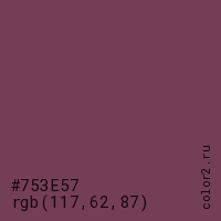 Цвет #753E57 в цветовой модели RGB обозначается тремя октетами (117, 62, 87) в десятичном формате и #753E57 в шестнадцатиричном (hex) формате, которые являются интенсивностью красного 117 (hex 75), интенсивность зелёного 62 (hex 3E) и интенсивность синего 87 (hex 57).