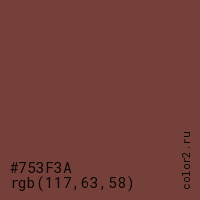 Цвет #753F3A в цветовой модели RGB обозначается тремя октетами (117, 63, 58) в десятичном формате и #753F3A в шестнадцатиричном (hex) формате, которые являются интенсивностью красного 117 (hex 75), интенсивность зелёного 63 (hex 3F) и интенсивность синего 58 (hex 3A).