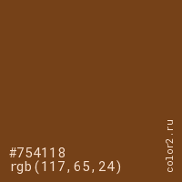 Цвет #754118 в цветовой модели RGB обозначается тремя октетами (117, 65, 24) в десятичном формате и #754118 в шестнадцатиричном (hex) формате, которые являются интенсивностью красного 117 (hex 75), интенсивность зелёного 65 (hex 41) и интенсивность синего 24 (hex 18).