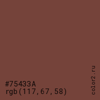 Цвет #75433A в цветовой модели RGB обозначается тремя октетами (117, 67, 58) в десятичном формате и #75433A в шестнадцатиричном (hex) формате, которые являются интенсивностью красного 117 (hex 75), интенсивность зелёного 67 (hex 43) и интенсивность синего 58 (hex 3A).