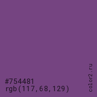 Цвет #754481 в цветовой модели RGB обозначается тремя октетами (117, 68, 129) в десятичном формате и #754481 в шестнадцатиричном (hex) формате, которые являются интенсивностью красного 117 (hex 75), интенсивность зелёного 68 (hex 44) и интенсивность синего 129 (hex 81).