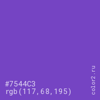 Цвет #7544C3 в цветовой модели RGB обозначается тремя октетами (117, 68, 195) в десятичном формате и #7544C3 в шестнадцатиричном (hex) формате, которые являются интенсивностью красного 117 (hex 75), интенсивность зелёного 68 (hex 44) и интенсивность синего 195 (hex C3).