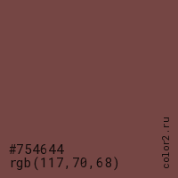 Цвет #754644 в цветовой модели RGB обозначается тремя октетами (117, 70, 68) в десятичном формате и #754644 в шестнадцатиричном (hex) формате, которые являются интенсивностью красного 117 (hex 75), интенсивность зелёного 70 (hex 46) и интенсивность синего 68 (hex 44).
