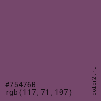 Цвет #75476B в цветовой модели RGB обозначается тремя октетами (117, 71, 107) в десятичном формате и #75476B в шестнадцатиричном (hex) формате, которые являются интенсивностью красного 117 (hex 75), интенсивность зелёного 71 (hex 47) и интенсивность синего 107 (hex 6B).