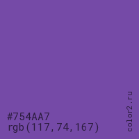 Цвет #754AA7 в цветовой модели RGB обозначается тремя октетами (117, 74, 167) в десятичном формате и #754AA7 в шестнадцатиричном (hex) формате, которые являются интенсивностью красного 117 (hex 75), интенсивность зелёного 74 (hex 4A) и интенсивность синего 167 (hex A7).