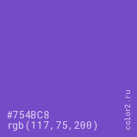 Цвет #754BC8 в цветовой модели RGB обозначается тремя октетами (117, 75, 200) в десятичном формате и #754BC8 в шестнадцатиричном (hex) формате, которые являются интенсивностью красного 117 (hex 75), интенсивность зелёного 75 (hex 4B) и интенсивность синего 200 (hex C8).