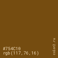 Цвет #754C10 в цветовой модели RGB обозначается тремя октетами (117, 76, 16) в десятичном формате и #754C10 в шестнадцатиричном (hex) формате, которые являются интенсивностью красного 117 (hex 75), интенсивность зелёного 76 (hex 4C) и интенсивность синего 16 (hex 10).
