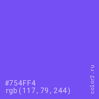 Цвет #754FF4 в цветовой модели RGB обозначается тремя октетами (117, 79, 244) в десятичном формате и #754FF4 в шестнадцатиричном (hex) формате, которые являются интенсивностью красного 117 (hex 75), интенсивность зелёного 79 (hex 4F) и интенсивность синего 244 (hex F4).