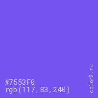 Цвет #7553F0 в цветовой модели RGB обозначается тремя октетами (117, 83, 240) в десятичном формате и #7553F0 в шестнадцатиричном (hex) формате, которые являются интенсивностью красного 117 (hex 75), интенсивность зелёного 83 (hex 53) и интенсивность синего 240 (hex F0).