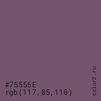 Цвет #75556E в цветовой модели RGB обозначается тремя октетами (117, 85, 110) в десятичном формате и #75556E в шестнадцатиричном (hex) формате, которые являются интенсивностью красного 117 (hex 75), интенсивность зелёного 85 (hex 55) и интенсивность синего 110 (hex 6E).