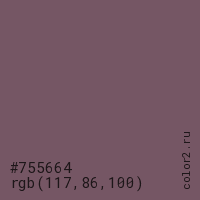 Цвет #755664 в цветовой модели RGB обозначается тремя октетами (117, 86, 100) в десятичном формате и #755664 в шестнадцатиричном (hex) формате, которые являются интенсивностью красного 117 (hex 75), интенсивность зелёного 86 (hex 56) и интенсивность синего 100 (hex 64).