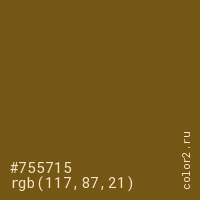 Цвет #755715 в цветовой модели RGB обозначается тремя октетами (117, 87, 21) в десятичном формате и #755715 в шестнадцатиричном (hex) формате, которые являются интенсивностью красного 117 (hex 75), интенсивность зелёного 87 (hex 57) и интенсивность синего 21 (hex 15).