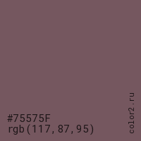 Цвет #75575F в цветовой модели RGB обозначается тремя октетами (117, 87, 95) в десятичном формате и #75575F в шестнадцатиричном (hex) формате, которые являются интенсивностью красного 117 (hex 75), интенсивность зелёного 87 (hex 57) и интенсивность синего 95 (hex 5F).
