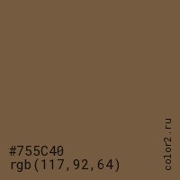 Цвет #755C40 в цветовой модели RGB обозначается тремя октетами (117, 92, 64) в десятичном формате и #755C40 в шестнадцатиричном (hex) формате, которые являются интенсивностью красного 117 (hex 75), интенсивность зелёного 92 (hex 5C) и интенсивность синего 64 (hex 40).