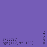 Цвет #755CB7 в цветовой модели RGB обозначается тремя октетами (117, 92, 183) в десятичном формате и #755CB7 в шестнадцатиричном (hex) формате, которые являются интенсивностью красного 117 (hex 75), интенсивность зелёного 92 (hex 5C) и интенсивность синего 183 (hex B7).