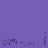 Цвет #755DB5 в цветовой модели RGB обозначается тремя октетами (117, 93, 181) в десятичном формате и #755DB5 в шестнадцатиричном (hex) формате, которые являются интенсивностью красного 117 (hex 75), интенсивность зелёного 93 (hex 5D) и интенсивность синего 181 (hex B5).