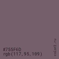 Цвет #755F6D в цветовой модели RGB обозначается тремя октетами (117, 95, 109) в десятичном формате и #755F6D в шестнадцатиричном (hex) формате, которые являются интенсивностью красного 117 (hex 75), интенсивность зелёного 95 (hex 5F) и интенсивность синего 109 (hex 6D).