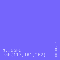 Цвет #7565FC в цветовой модели RGB обозначается тремя октетами (117, 101, 252) в десятичном формате и #7565FC в шестнадцатиричном (hex) формате, которые являются интенсивностью красного 117 (hex 75), интенсивность зелёного 101 (hex 65) и интенсивность синего 252 (hex FC).