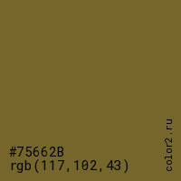 Цвет #75662B в цветовой модели RGB обозначается тремя октетами (117, 102, 43) в десятичном формате и #75662B в шестнадцатиричном (hex) формате, которые являются интенсивностью красного 117 (hex 75), интенсивность зелёного 102 (hex 66) и интенсивность синего 43 (hex 2B).