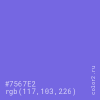 Цвет #7567E2 в цветовой модели RGB обозначается тремя октетами (117, 103, 226) в десятичном формате и #7567E2 в шестнадцатиричном (hex) формате, которые являются интенсивностью красного 117 (hex 75), интенсивность зелёного 103 (hex 67) и интенсивность синего 226 (hex E2).