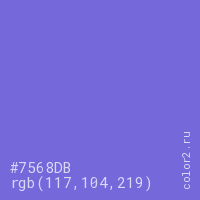 Цвет #7568DB в цветовой модели RGB обозначается тремя октетами (117, 104, 219) в десятичном формате и #7568DB в шестнадцатиричном (hex) формате, которые являются интенсивностью красного 117 (hex 75), интенсивность зелёного 104 (hex 68) и интенсивность синего 219 (hex DB).