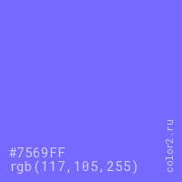 Цвет #7569FF в цветовой модели RGB обозначается тремя октетами (117, 105, 255) в десятичном формате и #7569FF в шестнадцатиричном (hex) формате, которые являются интенсивностью красного 117 (hex 75), интенсивность зелёного 105 (hex 69) и интенсивность синего 255 (hex FF).