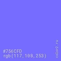 Цвет #756CFD в цветовой модели RGB обозначается тремя октетами (117, 108, 253) в десятичном формате и #756CFD в шестнадцатиричном (hex) формате, которые являются интенсивностью красного 117 (hex 75), интенсивность зелёного 108 (hex 6C) и интенсивность синего 253 (hex FD).