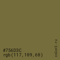 Цвет #756D3C в цветовой модели RGB обозначается тремя октетами (117, 109, 60) в десятичном формате и #756D3C в шестнадцатиричном (hex) формате, которые являются интенсивностью красного 117 (hex 75), интенсивность зелёного 109 (hex 6D) и интенсивность синего 60 (hex 3C).