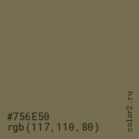 Цвет #756E50 в цветовой модели RGB обозначается тремя октетами (117, 110, 80) в десятичном формате и #756E50 в шестнадцатиричном (hex) формате, которые являются интенсивностью красного 117 (hex 75), интенсивность зелёного 110 (hex 6E) и интенсивность синего 80 (hex 50).