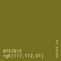 Цвет #75701F в цветовой модели RGB обозначается тремя октетами (117, 112, 31) в десятичном формате и #75701F в шестнадцатиричном (hex) формате, которые являются интенсивностью красного 117 (hex 75), интенсивность зелёного 112 (hex 70) и интенсивность синего 31 (hex 1F).